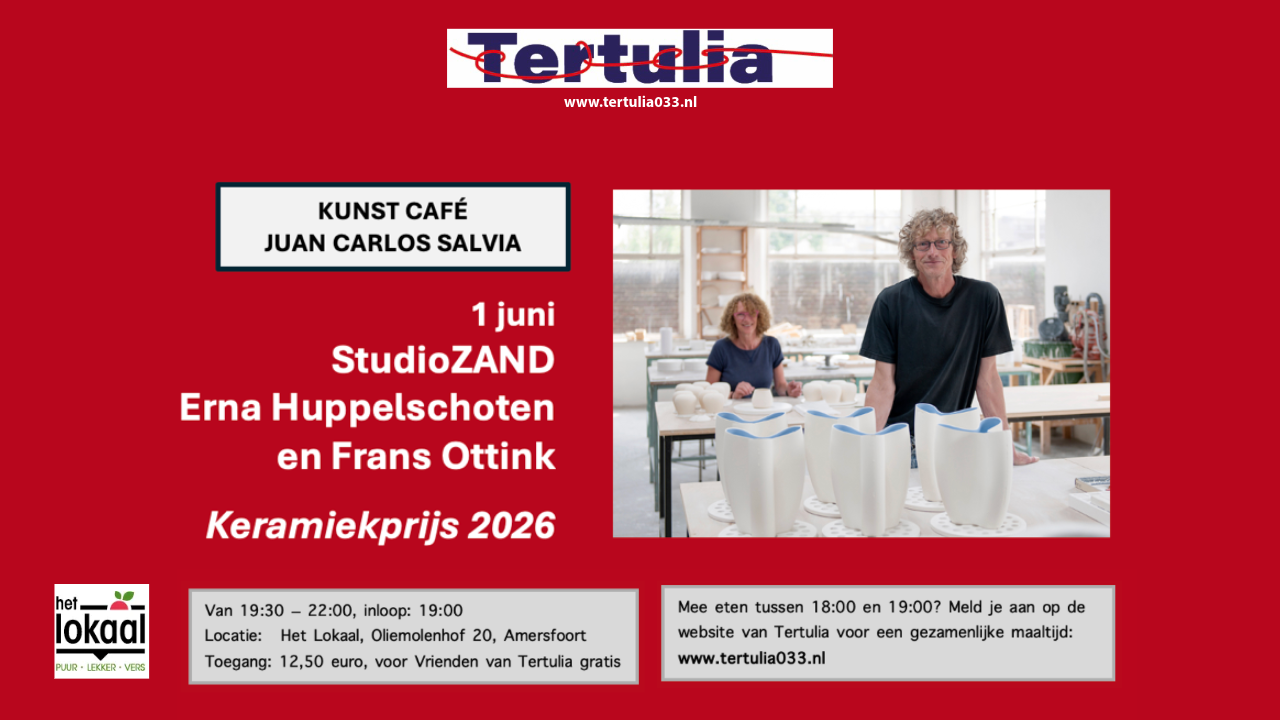 Voor een volle en levendige avond met Thijs Trompert stroomde op 13 april 2026 het Kunst Café van Tertulia vol. In een open gesprek met moderator Juan Carlos Salvia, verrijkt met vragen uit het publiek, ontvouwde zich een rijk gesprek over kunst, creatie en maakenergie. Met de aandachtige aanwezigheid van kunstenaars, vrienden en bekenden uit Amersfoort konden we genieten van Thijs’ authentieke manier van zijn. Daarnaast klonk er een bevlogen oproep voor Future Village door Ron Jagers en Chantal van Kempen (Kultlab). Een avond die blijft hangen. Het verslag van Elly van Eijk completeert de documentatie van deze bijeenkomst.