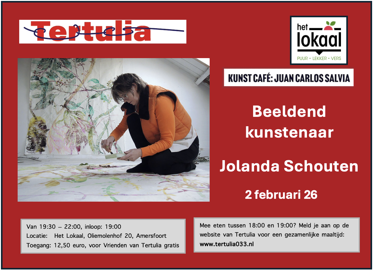 Op 2 februari 2026 was Jolanda Schouten onze gastspreker. Ze vertelde over haar werk van grote aquarellen en monumentale borduurprojecten, waarin samen creëren en verbinding centraal staan. Leden uit haar community werkten mee aan een grote tafel en nodigden het publiek uit om zelf ook te borduren. Het gesprek ontwikkelde zich tot een boeiende uitwisseling met een kunstminnend publiek, een mix van mannen en vrouwen, waarin ideeën, verhalen en inspiratie werden gedeeld