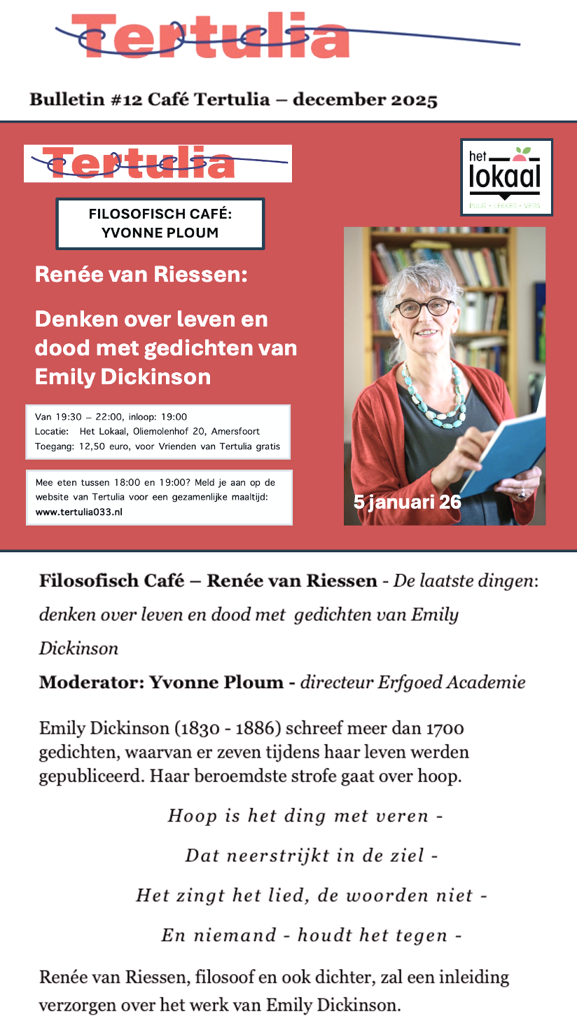Emily Dickinson in het Filosofisch Café een winterse improvisatie avond.. 5 januari werd een andere avond dan verwacht. De treinen reden niet, en Renée van Riessen kon niet aanschuiven. Toch kwamen velen — door sneeuw en stilte — naar Het Lokaal. Wat volgde was een Tertulia-avond rond de poëzie van Emily Dickinson. Niet via een lezing, maar in gezamenlijk lezen en interpreteren. In het verslag van Gerard de Kleijn krijgen een bromvlieg, een jachthond en overwinterende vogels een hoofdrol. Beelden die spreken over sterfelijkheid, eenzaamheid en verlangen — en over onszelf, als birds that stay.